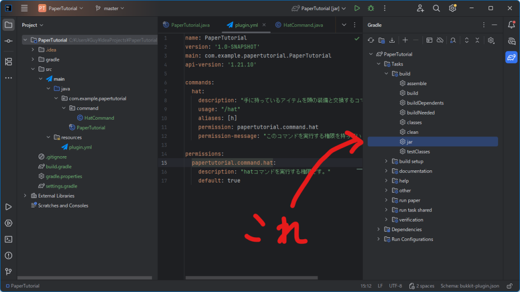 ★ToDo jarタスクで生成された build/libs/PaperTutorial-1.0-SNAPSHOT.jar を、サーバーの plugins フォルダに配置する
